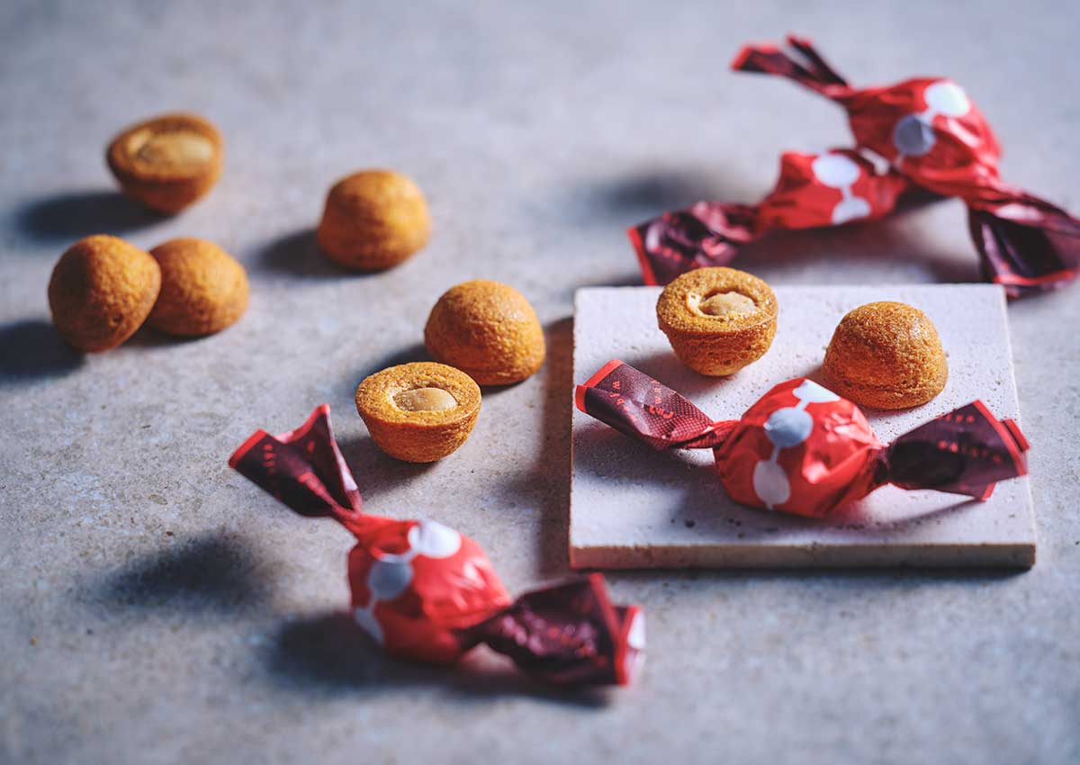 黒蜜とはちみつのコクのあるやさしい甘みが特徴の軽やかな生地で、香ばしくローストしたマカダミアナッツをまるごと一粒包みました。カリッとしたナッツと、さっくりと軽やかにほどけるどこか懐かしい味わいの生地を、かわいらしいおちょぼ口サイズにサクッと丹念に焼き上げました。その絶妙な食感と味は、パティシエの火入れの技があってこそ。