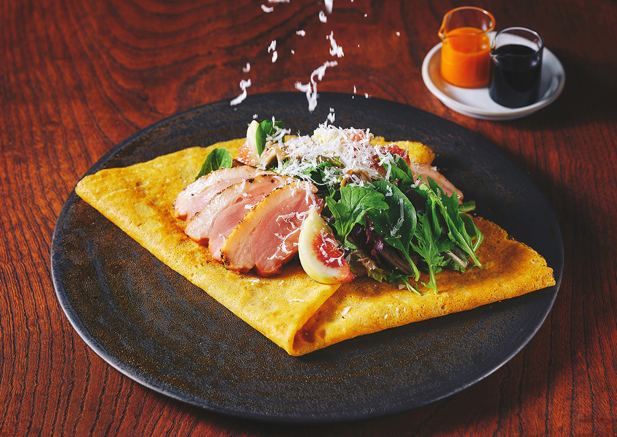 これまでデザートのクレープのみだったところに、食事クレープである「鴨ときのこサラダ」が登場します。合鴨ロースのパストラミときのこのサラダを、香り高い白ごまを混ぜ込んだ生地に合わせました。味のアクセントにはバルサミコソースとオレンジソースの2種類をお好みで。wabiyaのシェフが監修のもと誕生したボリューム満点のひと品です。
